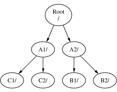 Supponiamo che tu abbia tre file system, chiamati A, B, e C. Ogni file system ha una directory root, la quale contiene altre due directory, chiamate A1, A2 (e nello stesso modo B1, B2 e C1, C2).