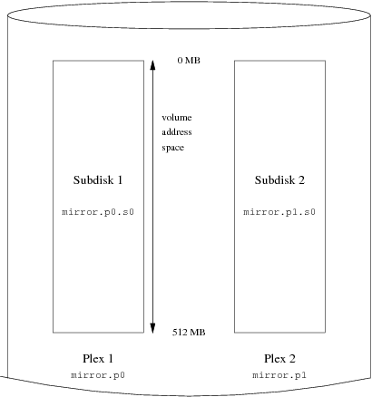 In questo esempio ogni plex contiene l'intero spazio di indirizzamento di 512 MB. Come nel precedente esempio ogni plex contiene un solo sottodisco.