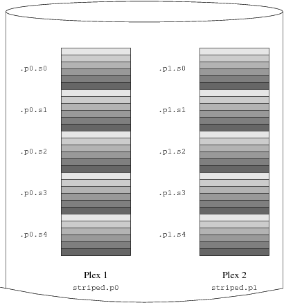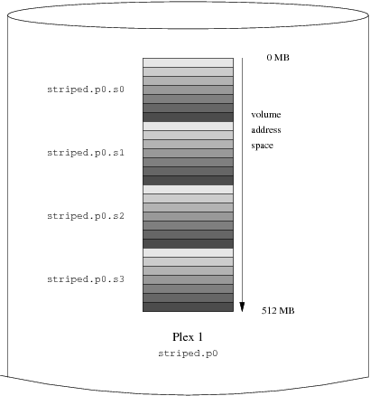 Il volume in mirroring dell'esempio precedente è più resistente alle rotture di un volume non in mirroring, ma le sue prestazioni sono inferiori: ogni scrittura sul volume richiede una scrittura su ognuno dei drive, utilizzando quindi una maggior frazione della banda passante totale dei dischi. Considerazioni sulle prestazioni portano ad un differente approccio: al posto del mirroring, i dati vengono posti sul maggior numero di dischi possibile utilizzando lo striping. La seguente configurazione mostra un volume con un plex in striping su quattro dischi: